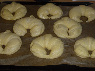 Nu håller jag på att baka de första ur "Den Franske Bagaren" det blev croissanter. Jag misslyckas helatiden med dom på jobbet så då tänkte jag vad tusan måste ju prova hemma med. Än så länge är dom bra. Men under kavlingen så såg jag att fettet delade på sig för smöret var för hårt. Jag fortsatte ändå och gjorde tre stycken tre slag i stället för två fyrslag som de stod i boken vilket jag läste när jag nästan va klar. Vad lär vi av detta läs hela receptet på en gång.